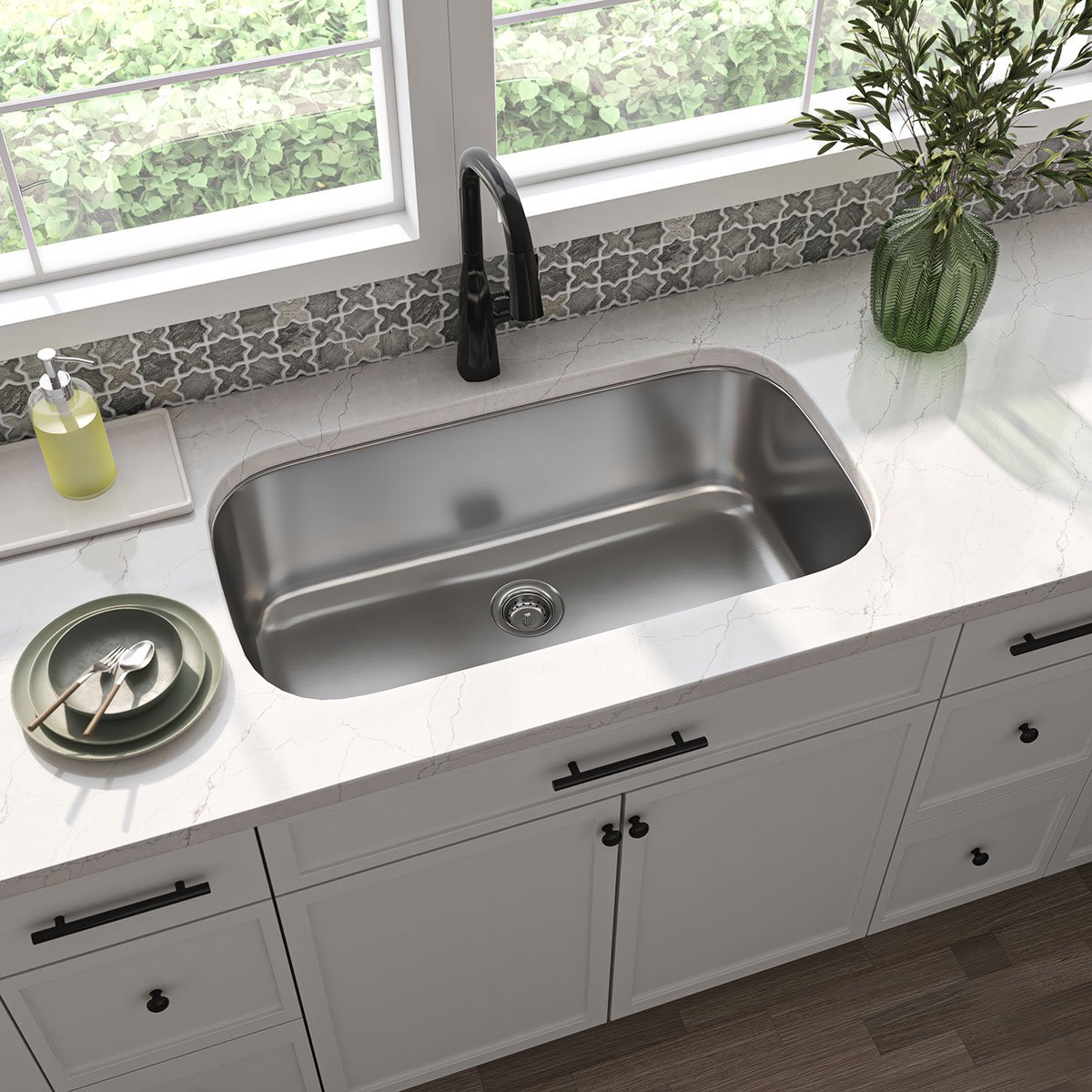 Sleek and modern, this undermount stainless steel sink features smooth curves and a spacious single bowl, seamlessly integrated into a white quartz countertop with subtle veining. Perfect for minimalist, contemporary kitchens.